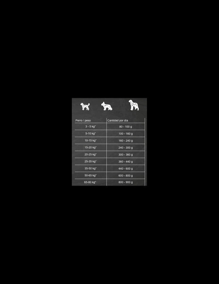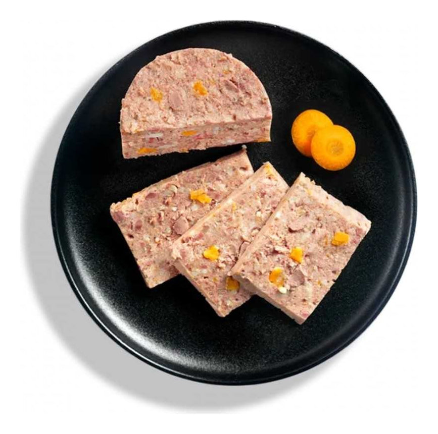 Carne, corazón, hígado y mollejas de pollo (40 %); carne y corazón de pato (25 %); caldo de carne de pollo y pato (24,5 %); mijo, cocido (4 %); zanahorias (4 %); semillas de chía (1 %); cáscaras de huevo, secas (0,5 %); minerales (0,5 %); aceite de cardo (0,5 %).