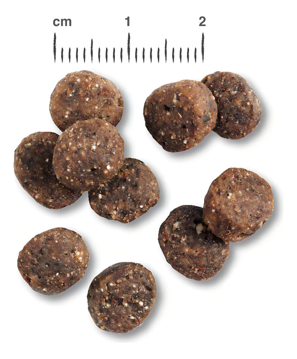 Salmón fresco (40 %); amaranto (16 %); fécula de patata; harina de guisantes; harina de pescado de agua salada; harina de salmón; zooplancton marino molido (krill, 5 %); levadura de cerveza secada (2,5 %); aceite de salmón; semilla de uva prensada por expulsor; vainas de algarroba, secas; salmón hidrolizado; semillas de chía; pulpa de remolacha seca, desazucarada; fosfato dicálcico; aceite de cardo; hierbas, secadas (total: 0,2 %; hojas de ortiga, raíz de genciana, centaura menor, manzanilla, hinojo, alcaravea, muérdago, aquilea, hojas de zarzamora); cloruro de potasio; cloruro de sodio; yucca schidigera.